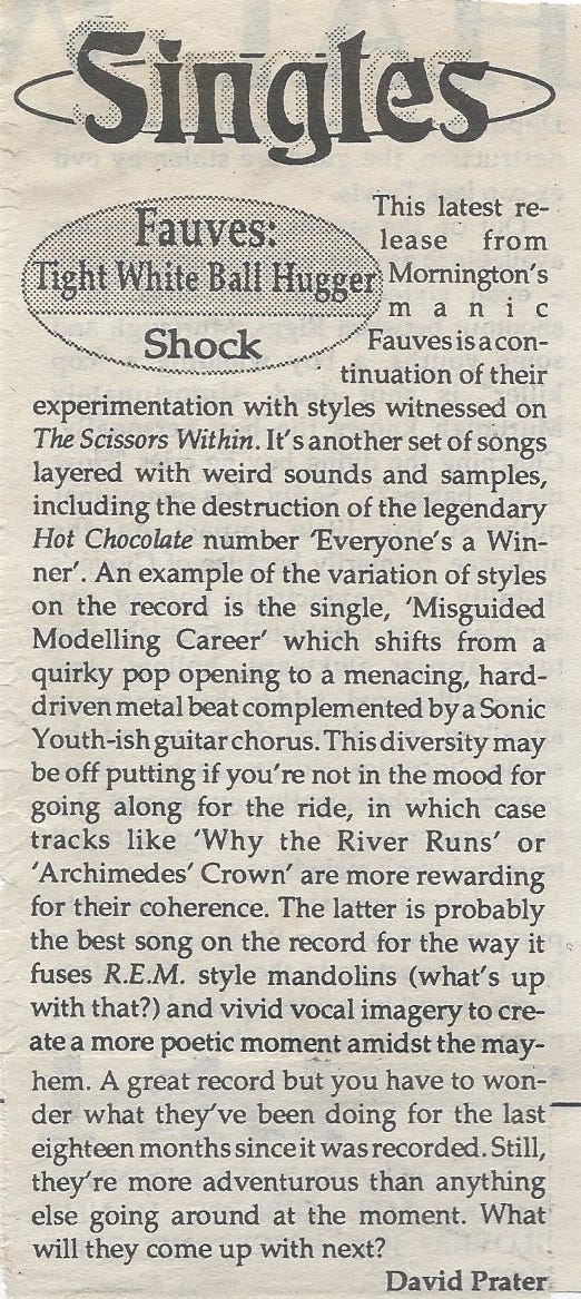 Why me? Well, I can only assume that Jon had seen my old blog post about the band’s early EPs and gauged, correctly, that I am a Fauves fan. In fact, I was a massive fan of the band when they first started getting airplay in Australia in 1990. I loved their angular take on Oz rock, and the fact that they hailed from the Mornington Peninsula (a part of Australia where my mother’s ancestors “settled”) gave my fandom additional secret meaning.